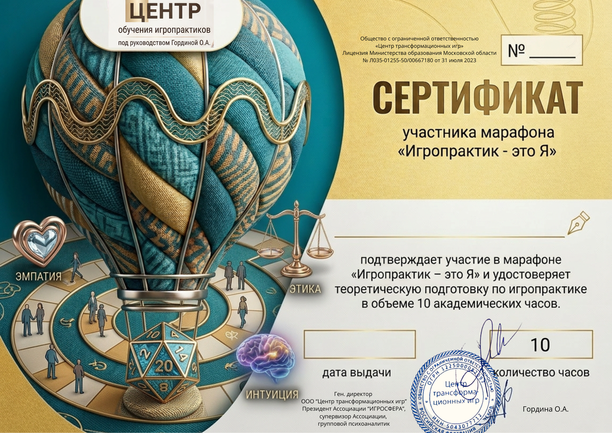 - В интенсиве есть возможность получить сертификат "Игропрактик - это Я". Для этого необходимо пройти все дни марафона и сдать тест, вопросы которого взяты из интенсива.
